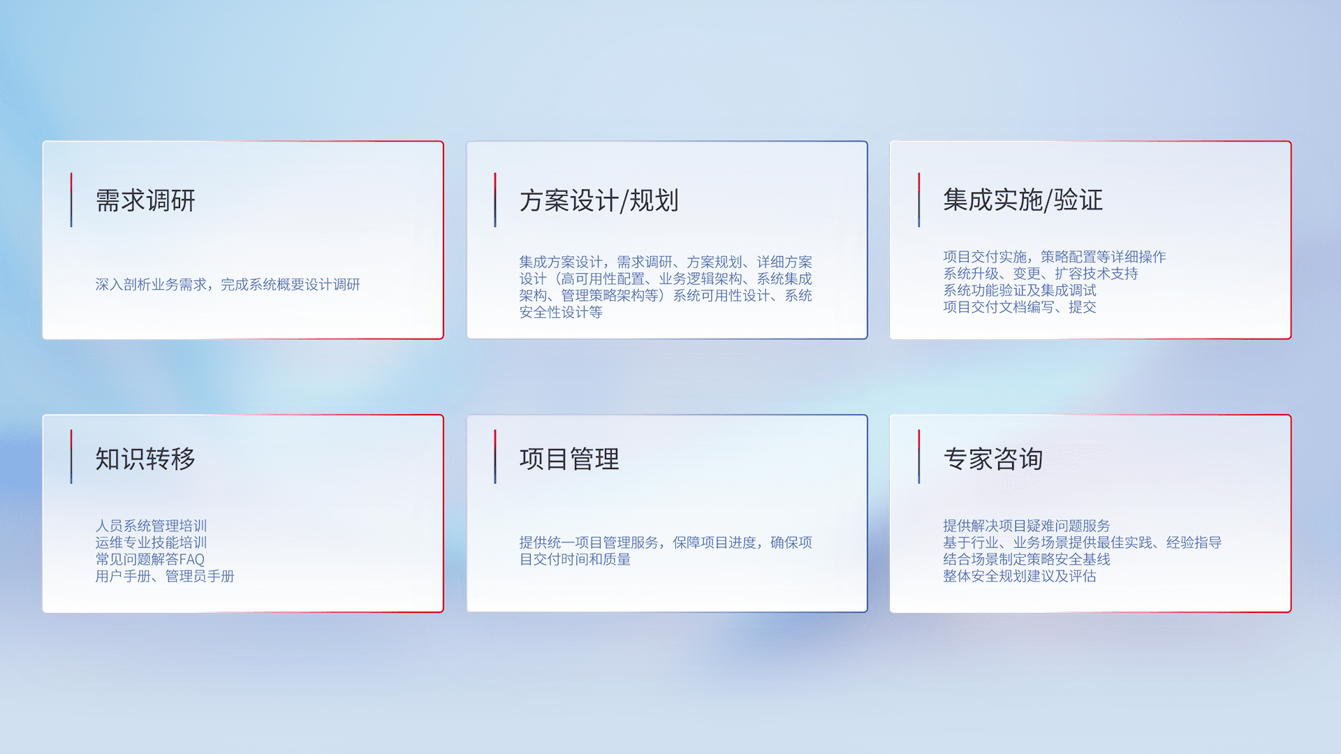 针对客户行业特性,,,将宏观的安全战略和需求,,,,通过专业的交付服务,,实现项目落地,,,,为客户提供标准规范的集成交付服务。。。